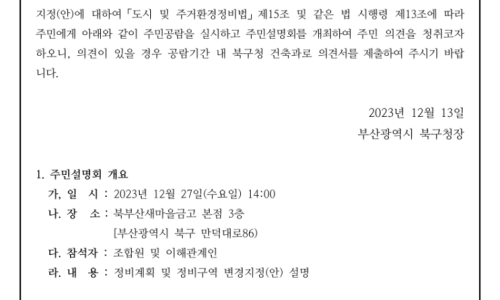 "23.12. 만덕3 재건축사업의 정비계획과 정비구역 변경지정(안)에 대한 주민공람이 실시되며, 주민설명회도 개최됩니다.