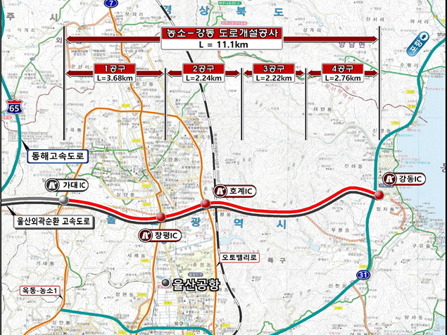 울산 북구 농소와 강동을 연결하는 11.1km 구간의 도로 개설 공사가 본격적으로 시작됐다. 이 도로는 자동차 전용도로로 설계되어 4차선으로 건설되며, 창평IC, 호계IC, 강동IC 등 주요 나들목이 신설될 예정이다.