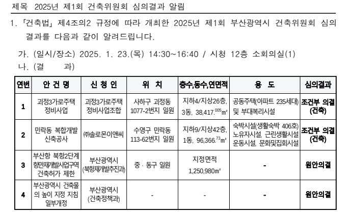 2025년 1월 23일에 열린 부산광역시 건축위원회의 제1회 심의 결과를 소개한다.